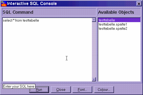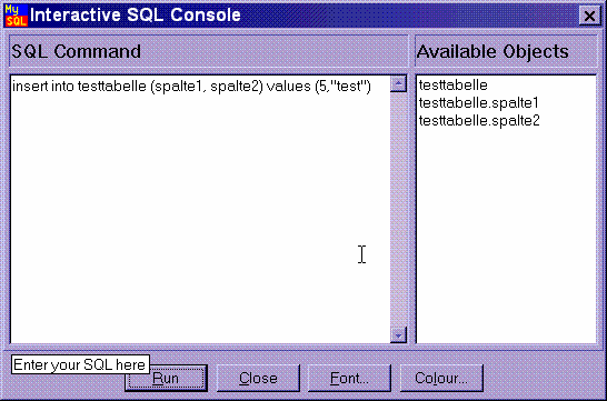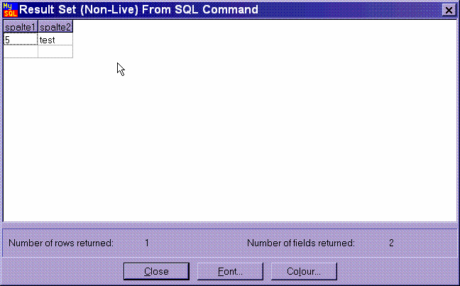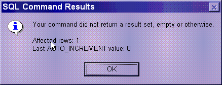 Klicken Sie auf "RUN". Sie sehen nun im Fenster das Ergebnis dessen, was der MySQL Serverdämon zurückmeldet. Hier wird nicht mehr die Zeit ausgegeben, wie beim originalen MySQL Client, jedoch sehen Sie hier, wieviele Zeilen in der Tabelle von Ihrem Statement betroffen waren: